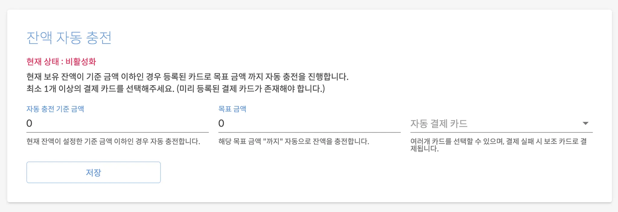 자동 충전 유의 사항 자동 충전 기준 금액은 200원 이상 설정해야 합니다. 목표 금액은 기준 금액보다 1만원 이상 높아야 합니다. 너무 잦은 자동 충전이 이뤄지는 경우 카드사에서 결제를 거절할 수 있습니다. (이 경우 카드사에 문의하여 해제해야 합니다.) 등록 된 카드가 없는 경우 자동 충전이 불가합니다.
