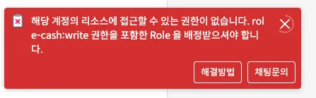 ”해당 계정의 리소스에 접근할 수 있는 권한이 없습니다. serviceName:write 권한을 포함한 Role 을 배정받으셔야 합니다.”