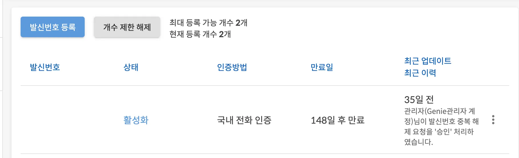 발신번호 만료일이 다가온다는 알림문자를 받으셨나요? 아니면 등록한 발신번호를 미리 갱신하고 싶으신가요? 그럴때는 발신번호 목록에서 갱신버튼 누르시면 됩니다. 갱신을 하실경우 등록시와 마찬가지로 ARS인증은 6개월 서류인증은 1년까지 오늘날짜 기준으로 연장됩니다.