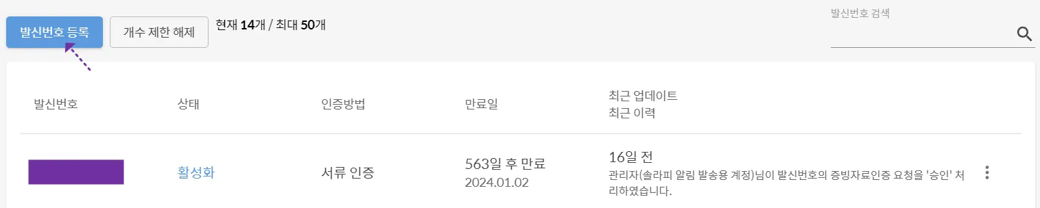 발신번호 관리에서 발신번호 등록 버튼을 누릅니다.